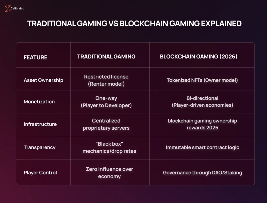 Web3 gaming differs from traditional gaming by providing players with true asset ownership. In traditional gaming, all data is stored on a publisher’s server, whereas blockchain gaming 2026 utilizes non custodial and custodial options to store assets on a public ledger, enabling blockchain gaming ownership rewards 2026.
