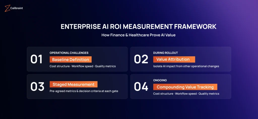 Stage Three: Staged Measurement Gates. Enterprise AI ROI in finance and healthcare rarely materializes fully within a standard financial quarter. The measurement framework should include defined gates at 30, 90, and 180 days, each with pre-agreed metrics, tolerances, and decision criteria. This structure prevents the common failure mode where early-stage results are compared against full-deployment benchmarks.