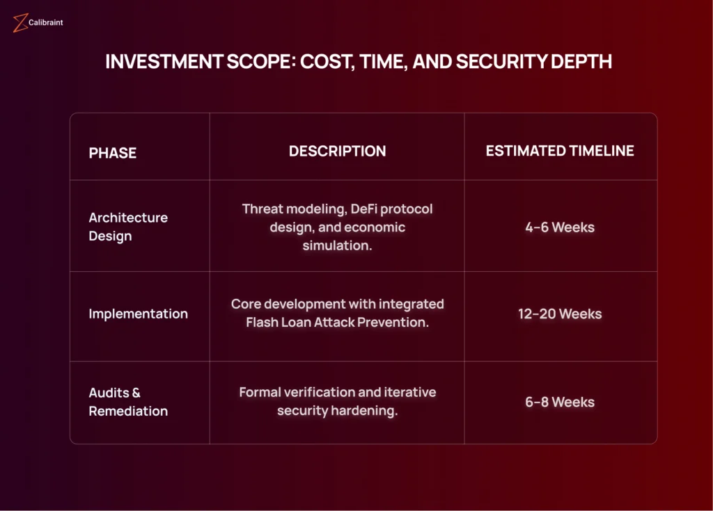 For a security-first MVP, enterprises should expect a budget range that reflects the complexity of the economic logic. Hardened, enterprise-grade systems designed to manage hundreds of millions in TVL require a deeper investment in formal verification and specialized DeFi Security Architecture.
