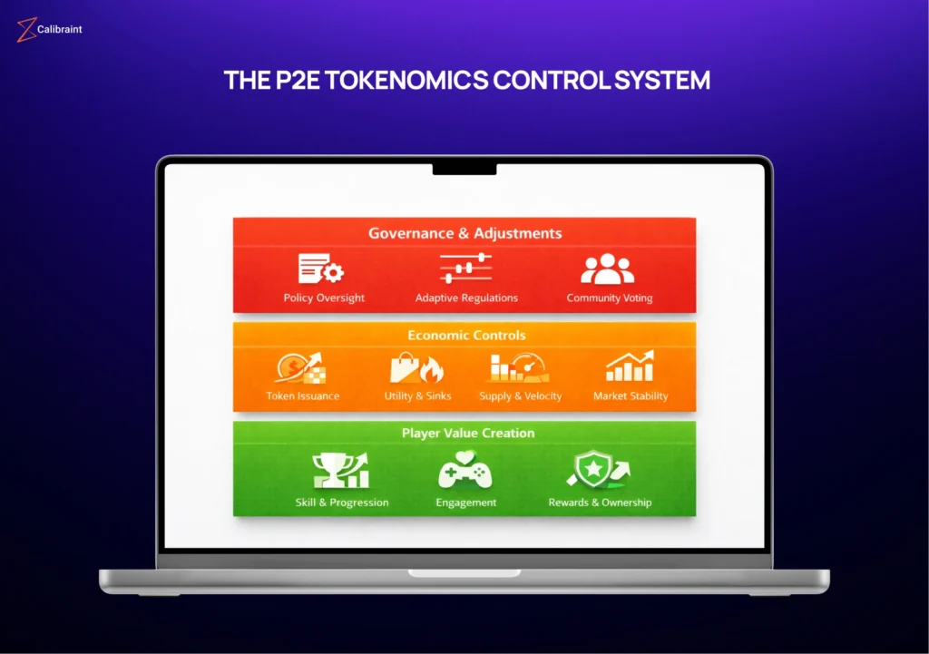 The infographic below captures how these three layers work together as a single P2E tokenomics control system, rather than isolated features competing for attention.