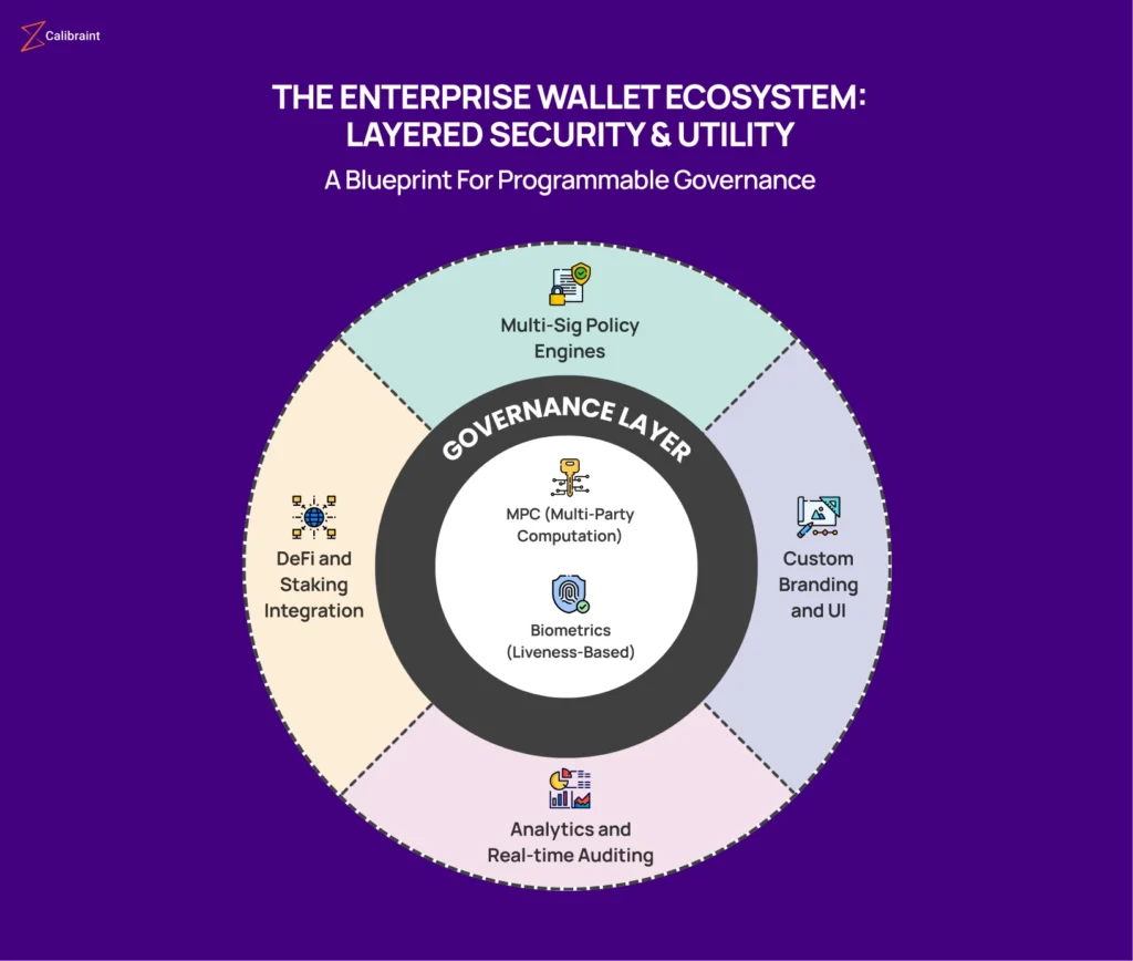 Calibraint works with enterprises to design and build secure, compliant, and scalable crypto wallet infrastructure tailored to real operational requirements. From MPC key management and compliance automation to white-label interfaces and deep system integrations, Calibraint approaches wallet architecture as a business system, not a standalone product.